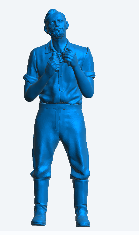 Dressed in a loose-fitting shirt with rolled-up sleeves, thigh-length trousers, and sturdy work boots, the figure embodies the look of a classic fishing boat crewman or coal trade sailor. Around his neck, he holds a pair of vintage binoculars, poised in a natural stance as he looks up into the distance, scanning the horizon for the next task or incoming weather. His rugged seaman’s beard completes the appearance of a seasoned mariner who has spent years working the unpredictable waters of the U.K. coastline.